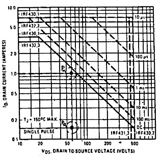 On the face of it all, the problems of thermal instability, which normally have to be considered in the bi-polar power transistor, could be solved by the use of the MOSFET power transistor. In setting up the amplifier under discussion , this was found to be not quite true. The push pull amplifier was biased to operate in a nominal class B mode with a standing drain current of 150 mA per transistor and a current swing up to 1 amp per transistor at full power. The power supply used was nominally 60 volts. Figure 1 shows the limiting conditions of drain current and source to drain volts for the IRF430 transistor. Pq is the static operating point set and Pm the point of maximum current swing.