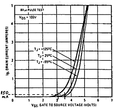 The explanation of this runaway effect is found in the transfer characteristic curves (refer figure 2). For a junction temperature of 25 degrees C, a standing current of 150 mA is achieved with a forward gate to source bias of 3.5V. At a junction temperature of 125 degrees C and the same bias, standing current rises to nearly 0.5 amp. To maintain the standing current at 125 degrees the same as it is at 25 degrees, bias must be reduced to 3.1V. Clearly, some form of circuit is required which senses the junction temperature and reduces the bias voltage as the temperature rises.