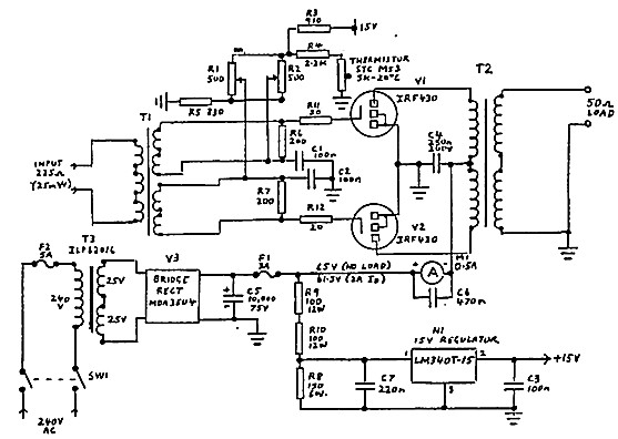 Detail of the circuit is shown in figure 3. Gate to source biasing is developed from a 15V supply through a resistive network. The individual static current in each transistor is set to 150 mA by potentiometers R1 and R2. A thermistor, cemented to the transistor heat sink as close as possible to the transistors, senses the temperature and reduces the bias voltage to correct for the rise in drain current as the temperature rises. (Referring back to Drew's article, it can be seen that he used a diode, fixed to the heat sink of his amplifier, for the same purpose.)
