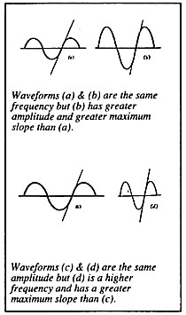 At low frequencies, the value of Vp approaches the voltage of the supply rail giving an output power calculation of over 100 watts. As frequency is increased, a limiting factor on the value of Vp called slew rate comes into effect. Slew rate is the maximum instantaneous change in output voltage that the amplifier can deliver in a given time. If we consider an output signal waveform, the maximum rate of change in voltage of the waveform, or the maximum slope of the waveform, increases with both frequency and amplitude of the waveform (refer figure 4). For a given frequency, maximum possible output voltage is achieved when the slope equals the amplifier slew rate. When frequency is increased, the maximum voltage swing is reduced and so also is the maximum power output. This explains why we can only get 55 watts at 1.8 MHz and an even lower value of 25 watts at 7 MHz.