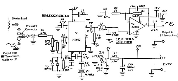 The circuit diagram of the converter is shown in figure 1. The conversion takes place in V1 (type NE602). The V1 circuit is almost identical to that used in my Active Loop Converter (Amateur Radio July, 2000 - ref 3) except that the input and output frequencies are reversed. I used the same 4 MHz xtal as in the receive converter as I had another one spare. Most HF amateur transceivers tune up to 4 MHz on the 3.5 MHz band so that it is simply a matter of setting the transceiver frequency to 4 MHz minus the LF transmission frequency. (4 MHz plus LF transmission frequency could also be used if the transceiver is tuneable above the 4 MHz. - This would make easier setting of the required HF frequency. Of course there is nothing to prevent some other crystal frequency being used with appropriate setting of the transceiver output frequency. ).