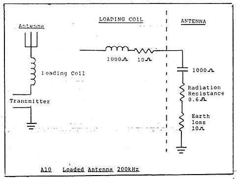 The biggest problem is achieving some sort of radiation efficiency in the antenna. A quarter wave Marconi antenna at 200KHz would have to be nearly 375 metres long, hardly the thing which would fit in the average back yard. Let's assume we hang up a long length of wire and achieve an effective height of 30 metres. This is 0.02 wavelength which would give us a calculated radiation resistance of 0.6 ohm. To resonate the antenna we need a series loading inductance with a reactance in the order of thousands of ohms. If the inductive reactance is 1000 ohms (800 microhenries) and the Q equal to 100, the loss resistance in the coil is equal to 10 ohms. It is not unreasonable to assume an earth loss resistance also of 10 ohms making a total loss resistance of 20 ohms. (Refer sketch). Antenna efficiency is therefore 100 x 0.6 / (0.6 + 20) percent or 2.9%. For 100 watts of power, we only radiate 3 watts.