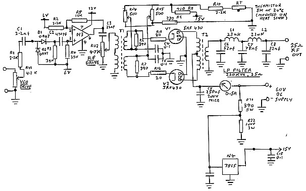 The nominal drain supply for the output transistors is 60 volt D.C. This is dropped down to 15V via regulator N4 for the gate bias supply.
