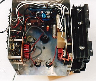 Using the output transformer as shown, the amplifier can deliver 70 watts into 25 ohms (or 100 watts into 18 ohms) with an efficiency around 60%. (The remaining 40% is of course heating of the transistors). The transistors are mounted on 6 inches (15.25mm) of Minifin heat sink via berylium insulating washers. With natural convection, the thermal resistance of the Minifin is around 1.3 degrees C per watt and the washers 0.1 degrees C per watt. As such, the temperature rise at the transistor cases could be around 56 degrees for an anticipated heat dissipation of up to 40 watts (continuous signal). This should hold the transistors within their temperature tolerance, but just to make sure, I bolted some extra aluminium fin material to the two sides of the Minifin. In practice operating at 70 watts of continuous output, the transistors run at quite a moderate temperature as felt by the hand. (Of course, in keyed operation the average output power and heat dissipation is even much less).