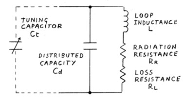 The equivalent circuit of the loop aerial is shown in figure 1. The predominant component is the loop inductive reactance, which is large compared with the sum of the radiation resistance Rr and the loss resistance RL. Because of the high ratio between reactance and resistance, Q factors are extremely high, in the order of many hundreds, and often greater than 1000. The loop is set to resonance at the operating frequency by parallel capacitance Ct connected across the loop. Maximum operating frequency is limited to a frequency set by the resonance of the loop inductance L with the loop stray capacitance Cd. Because of the high Q, bandwidth of the loop is very small and it is necessary to alter the tuning capacitance when changing frequency more than a few kHz. The Ted Hart design calls for remote control of the tuning network which adds some complication to the construction of the loop aerial system.