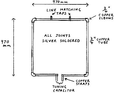 The loop was made up 0.97 metre square with 3/4 inch copper tube obtained from the local plumber. The tube was cut and assembled to the form shown in figure 2 using copper elbows for the right-angle joints which were silver soldered. Details of the loop and calculated constants for 14.2MHz are as follows: (Imperial measurements are used because the published formulae was given in these units):