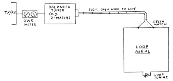 Now, having set the loop tuning and matching, this is how the system works. If we shift very far from the centre frequency, the high Q loop goes out of tune. The procedure is then to readjust the tuner for low SWR, in effect reflecting down the open wire line into the loop a reactance sufficient to correct for the detuning. Off the centre frequency, the open wire line works partly in a tuned mode. The nature of the impedance change placed across the line by the tuner is obviously a function of line length, but for the various random lengths of line I have used, a Z match tuner handles the correction nicely.
