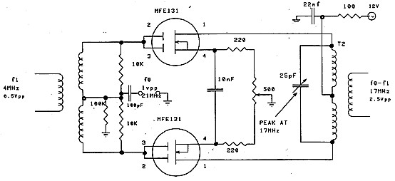 The same frequency conversion, in reverse, was required in the receiver where conversion was from 17 MHz down to 4 MHz using the same 21 MHz carrier. In this case the 21 MHz is well removed in frequency from 4 MHz and no problem was experienced in using an ordinary dual gate MOSFET mixer similar to Figure 9.