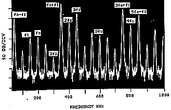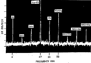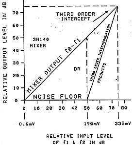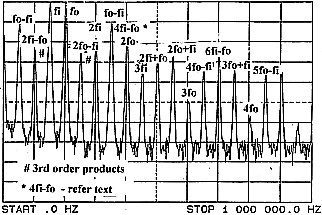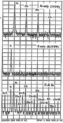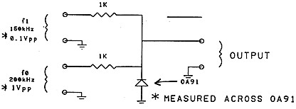![]() (Vo1tages across diode fO = 1 VPP, fl = 1 VPP) Y scale on graph is 10 dB per division. |