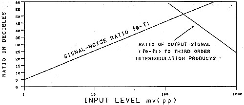 In Figure 17, the noise floor is recorded as 0 dB output and this information, together with levels of signal and intermodulation products, is transferred to a different form in Figure 18. Here we show the signal to noise ratio as a function of input signal level on one curve and the ratio of signal to intermodulation products as a function of input signal level on the other. Observe that there is an optimum operating level where the curves cross and where the output signal is 50 dB above both the noise and the IMD products.