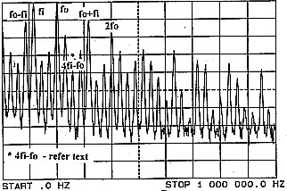 At the output of a mixer, there are many more components than the sum and difference of the input frequencies. To illustrate these on a spectrum analyser, a simple mixing circuit, using a germanium diode, was set up as shown in Figure 3. Signal fo was set at 1 VPP across the diode, just sufficient to sweep the operating point of the diode over the curvature of its voltage versus current characteristic and signal fi was set lower at 0.1 VPP The two frequencies of I50 kHz and 200 kHz, used for fi and fo respectively, are of no particular significance other than to demonstrate the effects.