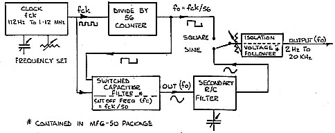 The basis of the system is shown in the block diagram, Figure 1. A clock (fck), tunable within the range of 112 Hz to 1.12 MHz drives both the switched capacitor fitter and a divide by 56 counter which gives square wave output in the range of 2 Hz to 20 kHz. The counter output is fed to the input of the filter which has a cut off' frequency (fc) equal to fck divided by 50, that is, 12 percent higher than the output frequency of the counter. With this arrangement, odd order harmonics in the square wave are attenuated to a level less than 60 dB below the fundamental frequency. Whatever the fundamental frequency, the cut off frequency tracks at 12 percent higher because both are controlled by the same clock source.
