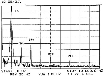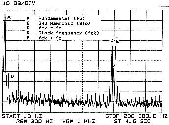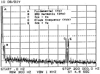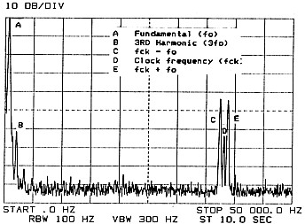 Figure 6 is a spectrum plot showing the level of harmonics in the output. The highest level component is the third harmonic at 62 dB down and other odd order harmonics are more than 80 dB down. The second order component, 65 dB down, is not actually a harmonic originating from the square wave at the input to the filter. It is caused by interference from the second to last stage of the counter running at the second order frequency.