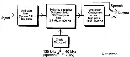 Figure 1 illustrates the filter system in block form. For speech, the LP filter is operated on its own. For CW its cut-off frequency is lowered and its output fed via the HP filter section.
