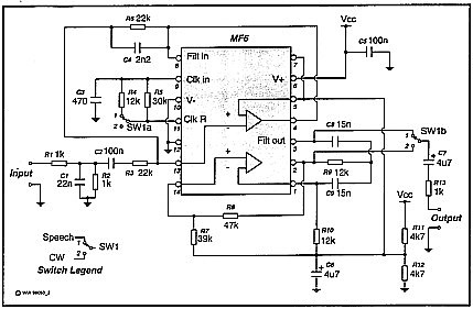 The clock frequency is set by components C3, R4 and R5. Switch S1 selects speech or CW and its contacts S1a alter the resistance in the circuit to change the clock frequency and hence the LP cut-off frequency. Components C8, C9, R7, R8, R9 and R10 make up the HP Chebychev active filter in conjunction with one of the MF6 internal operational amplifiers. Switch contacts S1b connect the output either direct from the LP circuit or via the HP circuit.