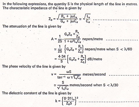The transmission line can be represented by four electrical line constants which, if measured, can be used to calculate characteristic impedance, attenuation, velocity factor and other characteristics.