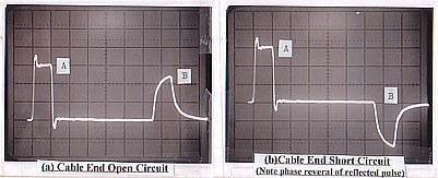 As can be seen in figures 9 and 10, transmission within the cable degrades the rise time of the reflected pulse and to maintain accuracy of measurement, time should be measured between the leading edges of the initiating and reflected pulses.