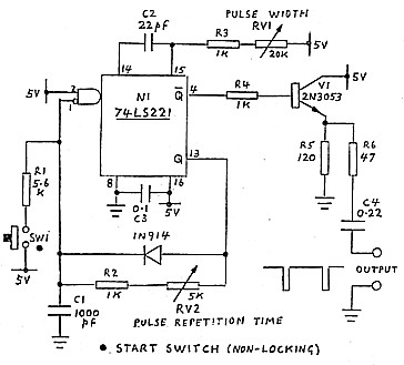 A simple pulse generator for pulse echo measurements can easily be made using readily available integrated circuit packages. An example of such a generator, experimented with by the writer, is shown in figure 11. This is based on an idea found in one of the ETI circuit books and submitted to ETI by Philip Dennis. The pulse is generated by a monostable multivibrator N1 with pulse width controlled by the values of C2, R3 and RV1. The circuit is arranged to re-trigger itself at a pulse repetition time set by the values of Cl, R2 and RV2. Using the circuit values shown, pulse width is adjustable between 50 and 500 nanoseconds and pulse repetition time is adjustable between 0.5 and 10 microseconds. A non locking start switch or button SW1 was found to be a necessary inclusion in the circuit as the pulse train did not always start itself on power up. Emitter Follower V1 provides a low source resistance to feed the test cable.