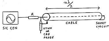 If the end of a transmission line is short circuited, a current node occurs at a half wavelength (and any subsequent half wavelengths) from the shorted end. This can be used to measure the velocity factor of a line or cable as shown in figure 12. For this test, a signal generator is fed via a resistor to one end of the cable and the other end is a short circuit. A high impedance probe from a VTVM or a CRO is connected right at the signal source end. The frequency of the signal generator is adjusted for a dip in voltage reading on the VTVM or CRO indicating a current node. Using this frequency in the calculation, velocity factor is derived as follows:
