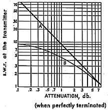 A further suggestion is offered by the writer to resolve lower values of attenuation. To achieve this, we create a lower finite value of SWR at the load end of thecable. Curve B of figure 13 is a corrected curve for SWR at the transmitter verses matched attenuation when the SWR at the load is lowered to 10. This SWR can be achieved by terminating the cable in a resistance equal to one tenth of Zo. For example, use a 5 ohm termination for a 50 ohm cable. If the transmitter power is kept low, a number of carbon resistors in parallel can provide the termination. Applying curve B, low values of attenuation can be derived from lower and more readable, values of SWR than those obtainable using a short circuited cable.