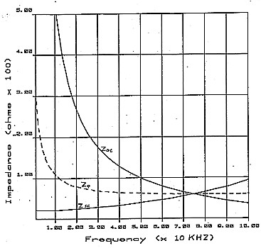At high frequencies, the square root of Ls/Cd calculates to 54.5 ohms and close to that derived in the curve of figure 4. At the measuring frequency of 20 kHz, the complex quantities calculate to give Zo = 80.7 ohms. For those unfamiliar with complex numbers and "J" notation, where you see a term such as "R + jX" simply calculate impedance (or admittance) using the square root of the sum of the squares, as in Formula 4.