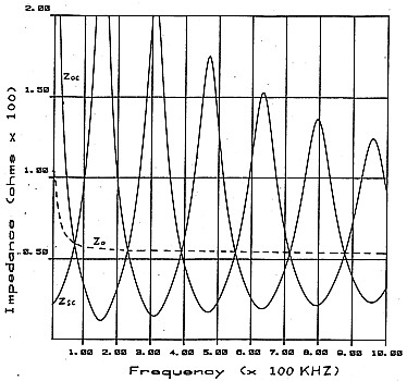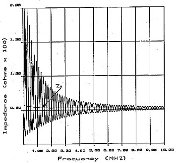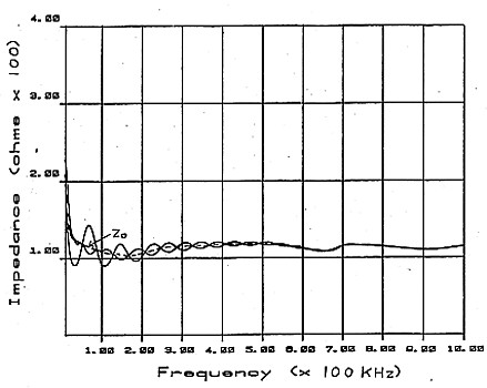 Figure 3 shows open circuit and short circuit impedance measurements carried out on 300 metres of RG122U 50 ohm coaxial cable over a frequency range of 1 kHz to 100 kHz. The calculated Zo has been added and this illustrates the rise in the value of Zo at low frequencies and the near constant value of Zo, just above 50 ohms, at high frequencies. Figure 4 shows the same cable plotted from 10 kHz to 1 MHz. Observe how the Zo line can be drawn through all the intersection points of Zoc and Zsc. Figure 5 extends the frequency even further with a plot from 100 kHz to 10 MHz. It can be seen that as the frequency is made higher, the excursion of Zoc and Zsc from the value of Zo becomes less, approaching nearer to the condition of an infinite line. The effect would be the same if the frequency were held constant and the length of line gradually increased.