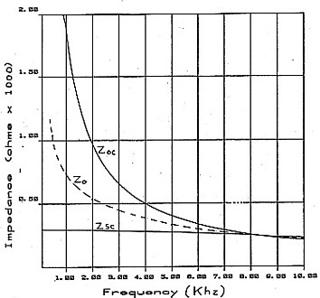In figure 6, the same type of measurements have been carried out on a one Kilometre length of telecommunications type twisted pair, over a frequency range of 100 Hz to 10 kHz. For this length of line, Zsc can be seen to be fairly constant at low frequencies, defined essentially by the DC resistance of the cable. On the other hand, Zoc rises rapidly as the frequency is decreased and the reactance of Cd rises. The characteristic impedance of this type of cable is nominally around 130 ohms at high frequencies, but in the voice frequency range, its impedance is in the region of 500 to 1000 ohms. This explains why a twisted pair is considered as a 600 ohm circuit in our voice frequency telephone system.