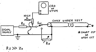 A simple method to measure open circuit and short circuit impedance is shown in figure 8. A signal generator is fed via resistance Rs into the line load or substitution resistor Rx, as selected by switch Sw. Rs is made high to simulate a constant current source. Assuming constant current, voltage across the line or resistor load is directly proportional to the impedance of the load. Sw is first selected to connect the cable with its end open circuit. Voltage fed to line is measured using a cathode ray oscilloscope (CRO) or a vacuum tube volt meter (VTVM) coupled through a high impedance probe. The switch is then operated to connect variable resistor Rx which is adjusted to obtain the same voltage. The resistance value of Rx is now equal to the open circuit impedance and if Rx is uncalibrated, its value can be measured using a multimeter or resistance bridge. The procedure is then repeated with the end of the cable short circuited to obtain short circuit impedance.