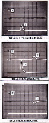 In figure 9 (c), a short circuit is placed across the cable end. Again, the pulse is reflected back to the input 3 microseconds later. It can be seen that the reflected pulse C is now inverted and this is because a reflection from a short circuit, or a lower resistance than Zo, produces a phase reversal. If "t" is the time recorded between pulses C and A and "S" is the length of the cable, velocity factor (V), or the ratio of phase velocity in the cable to that in space, is calculated as follows: