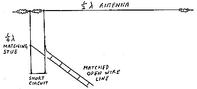 The end fed inverted V has been used as a multi-band antenna at the writer's home for many years and with considerable success. In this case on 20 metres, the open wire line is matched to the end of the antenna using the quarter wave matching stub. The shorting clip for the stub is just outside the radio shack door and on 40, 15 and 10 metres, the short is removed and the twin open wire line and part of the stub all become the tuned line used on these bands. On 80 metres, the feeder wires are paralleled and the antenna plus feeder and stub become a Marconi antenna operated against ground radials. On this band the radiator is a little over a quarter wave long.