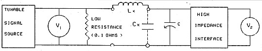 A basic Q meter is shown in Figure 1. Terminals are provided to connect the inductance (Lx) to be measured and this is resonated by a variable tuning capacitor (C). Terminals are also provided to add capacitance (Cx), if required. The tuned circuit is excited from a tunable signal source which develops voltage across a resistor in series with the tuned circuit. The resistor must have a resistance small compared to the loss resistance of the components to be measured so that its value can be ignored. A resistance of a mere fraction of an ohm is necessary. Metering is provided to measure the AC injection voltage across the series resistor and the AC output voltage across the terminals of the tuning capacitor. The output measurement must be a high input impedance circuit to prevent loading of the tuned circuit by the metering circuit.