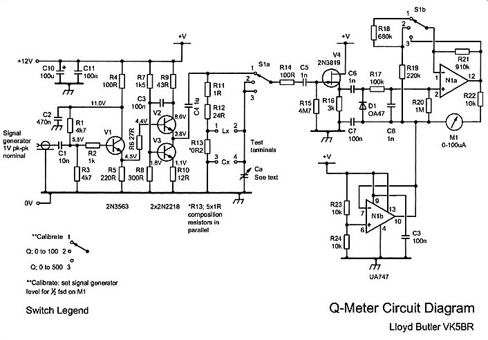 Selector switch (S1) has three positions. The first position, labelled CAL, is used to set the signal input level which is adjusted for half scale reading on meter M1. (A signal level of around 1 VPP is needed at the input of V1). When the signal is set to the correct level, switch position 2 provides direct reading of Q = 0 to 100 on the meter and switch position 3 provides direct reading of Q = 0 to 500 on the meter. For low values of Q, the calibrate level at switch position 1 is increased to full scale on the meter so that switch position 2 reads 0 = 0 to 50.