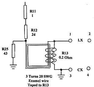 To cancel this effect, the circuit modification shown in figure 4 has been devised. The idea is to develop a reverse field around R13 from the current flowing into it so that the offending inductance is cancelled. To get enough field, three series connected conductors carrying the input current are taped to the five parallel resistors making up the 0.2 ohm R13.