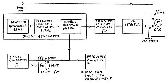 To achieve this for a range of frequencies, it is easiest to sweep a single frequency (say 1MHz) and heterodyne this to the test frequency required. The system developed is shown in the block diagram, figure 2. A 1MHz oscillator is frequency modulated by the output of a sawtooth generator operating at 33 Hz. The modulated output is beat with an external signal generator set to provide the difference frequency centered at the center frequency of the filter or IF circuit under test. The output of circuit under test is fed to a simple AM detector which provides varying DC output level to fed the CRO vertical input. By synchronising the CRO sweep circuit to the 33 Hz sweep generator, a plot of test circuit response is displayed in terms of amplitude verses frequency