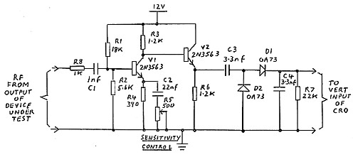 A simple AM detector is all that is required to convert the amplitude varying RF signal to a varying DC level for the CRO vertical input. The time constant of the RF filter must be sufficient to remove the RF ripple, but short enough for it to follow the amplitude variations. If the IF channel of an AM receiver were being measured, the AM detector in the receiver would do the job nicely without any further circuitry.
