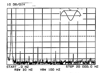 Figure 1 shows the spectrum of a sine wave oscillator with fundamental at 1000 Hz and harmonics up to 20 kHz. The highest level harmonic at 7 kHz is 70 dB below the fundamental, representing a harmonic distortion of 0.03 percent. This is a very good oscillator which would not be matched by many laboratory instruments. It can also be seen that the noise floor is about 95 dB below the fundamental and this is also very good. The oscillator noise level might be even better than this as much of the noise is due to the spectrum analyser itself.