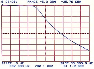 Another useful function of the spectrum analyser is to plot the frequency response of a four terminal device such as an amplifier or a filter. In this case, the analyser frequency sweep generator is fed to the input of the device and the output of the device is fed to the input of the analyser. Typical plots of a low pass filter and a bandpass filter are shown in Figures 10 and 11 respectively