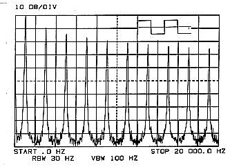 Figure 2 shows a 1000 Hz square wave. A perfect square wave generates odd harmonics to infinity with an amplitude 1/n relative to that of the fundamental or (20 log n) dB below the fundamental. ('n' is the order of harmonic). For n = 3, 5, 7 and 9 this calculates to -9.5, -14, -16.9 and -19.1 dB respectively, very close to the readings shown in Figure 2.