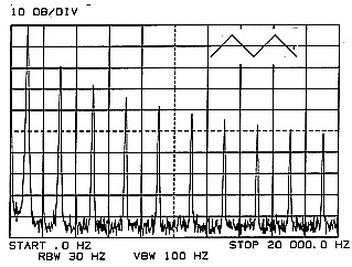 Figure 4 shows a 1000 Hz triangular wave. A perfect triangular wave also generates odd harmonics to infinity, but each amplitude is (l/n) squared relative to the fundamental or (40 log n) dB below the fundamental. For n = 3, 5, 7, and 9, the calculation is -19, -28, -33.8, and -38.2 dB respectfully, again very close to the readings shown.