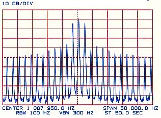 In Figure 6, the modulation level has been increased to 100 percent and the side frequencies, 1 kHz either side of the carrier, are now 6 dB below carrier level, or half its amplitude. The spectrum has been expanded to show many more harmonically related sideband components which now appear. Except for those close to the carrier, most of the components are more than 50 dB down and not of any great concern.