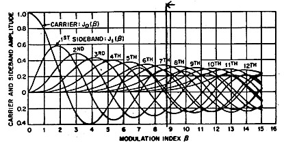 If we now examine Figure 9, which plots the amplitude of the carrier and side frequencies against the value of modulation index, we can see that there are a number of values of modulation index where the carrier level becomes zero. These are very convenient references to calibrate the amount of deviation. In Figure 8, the deviation has been set to produce the third carrier null at a modulation index of 8.650, so we know precisely that with our modulating frequency of 1000 Hz, our deviation is 8.650 x 1000 = 8850 Hz.