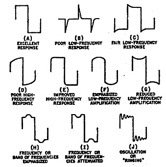 ![]() | Figure 1: Typical Square-Wave Response Patterns (A) Excellent Response (B) Poor Low Frequency Response (C) Fair Low Frequency Response (D) Poor High Frequency Response (E) Improved High Frequency Response (F) Emphasised Low Frequency Amplification (G) Reduced Low Frequency Amplification (H) Frequency or Band of Frequencies Emphasised (I ) Frequency or Band of Frequencies Attenuated (J) Oscillation or "Ringing" |