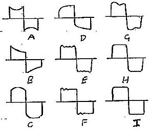 ![]() | Figure 2 - Typical Square-Wave Response Patterns (A) Deficient in Low Frequency, No Phase Error (B) Deficient in Low Frequency, Phase Advance (C) Excess Low Frequency, No Phase Error (D) Excess Low Frequency, Phase Delay (E) Deficient in High Frequency, No Phase Error (F) Deficient in High Frequency, Phase Delay (G) Sharp Cut-off above Square Wave Frequency (H) Gradual Cut-off above Square Wave Frequency (I) Gradual Cut-off at higher frequency than (h) |