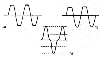 ![]() | Figure 6 - Distortion Waveforms. (a) Amplifier Overdriven. (b) Amplifier Operating Point not centered. (c) Crossover Distortion in Class B Stage. |