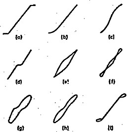 ![]() | Figure 7: Sine Wave Testing with Amplifier Input and Output fed to X and Y Plates of CRO, respectively (a) Amplifier Overdriven (b) Anode Bend Distortion in Valve Amplifier (c) Curvature Distortion (d) Crossover Distortion in a Class B Output Stage (e) Magnetising Current Distortion (f) As (e) with Phase Distortion later in the Chain (g) As (d) with Phase Distortion earlier in the Chain (h) As (c) with Phase Distortion earlier in the Chain (i) As (a) with Phase Distortion later in the Chain |