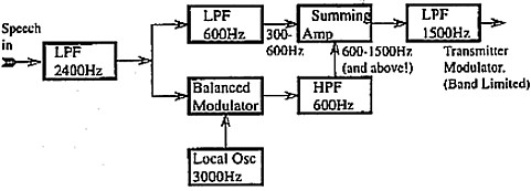 Figure 2 shows how the speech bandwidth is compressed to feed into the transmitter. The speech is fed via a 2400 Hz low pass filter to restrict upper frequency, out of range, components. A 600 Hz low-pass filter separates the lower frequencies. The whole spectrum to 2400 Hz is fed to a balanced modulator to mix with a 3000 Hz local oscillator. Output components are removed from the modulator below 600 Hz by a low-pass filter. The 1500 to 2400 Hz input components to the modulator are converted at its output to a range of 1500 to 600 Hz but in addition there are a lot of other frequency components generated above 1500 Hz. All the modulator output components above 600 Hz are then summed with the 300 to 600 Hz components at the other leg and fed through a 1500 Hz low pass filter which eliminates the unwanted components above 1500 Hz. Our audio signal is now restricted to 1500 Hz bandwidth to feed the transmitter modulator.