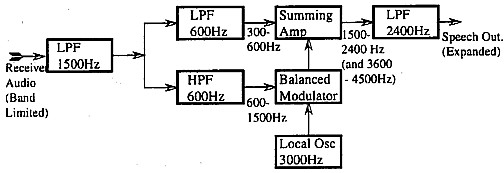 At the receiving end, the audio output from the receiver is in the compressed bandwidth form and it must be expanded in a reverse process to restore intelligibility. This is illustrated in figure 3. The receiver audio is first fed through a 1500 Hz low pass filter to remove any higher frequency extraneous components. The frequencies below 600 Hz pass through the low pass filter while those above pass through the high pass filter. The output components from the high pass filter, above 600 Hz, are fed to a balanced modulator where they are mixed with a fixed 3000 Hz local oscillator.