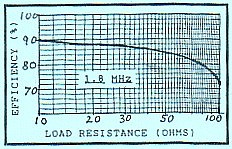 Figure 2 shows the results of power efficiency tests at 1.8 MHz. Efficiency is around 85 to 90% for load resistances of 50 ohms and below. As load resistance is raised, efficiency falls away, but as indicated in the earlier paragraph, this is probably irrelevant for most amateur antenna installations used at 1.8 Mhz..