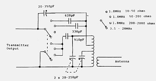 Figure 1 shows the original Z Match circuit modified to include 1.8 MHz. The addition of three fixed capacitors and a 4 position switch gives the whole load resistance range at 1.8MHz. If satisfied with just the lower resistance range, two fixed capacitors and a two position switch would do the job. To check operation, I used ordinary 350 volt mica capacitors. With these fitted, I fed over 200 watts through the tuner into a dummy load and later into my 1.8MHz antenna. Nothing arced or blew apart but I strongly suggest higher voltage capacitors if they can be obtained. I later built a unit with higher voltage fixed capacitors and wider spaced variable capacitors for higher power operation.