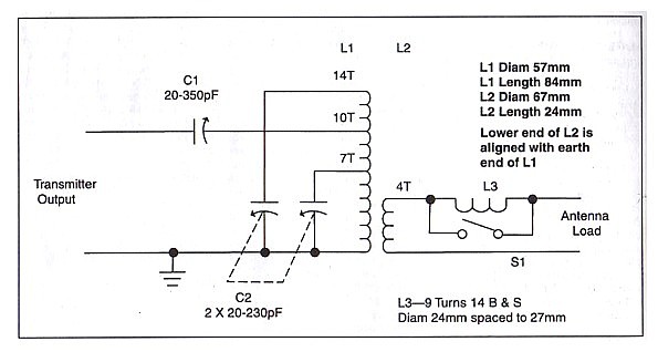 Variable capacitors Cl and C2 are tuning gang types with around 0.25 mm plate spacing and recovered from old radio receivers. Whilst these capacitors might be difficult to purchase off the shelf, they are often picked up at amateur radio trading marts. The plate spacing is fine for the usual transceiver RF power of 100 watts. It is a bit marginal for higher powers and under some matching conditions, arcing across the plates might be experienced at the amateur power limit of 400 watts.